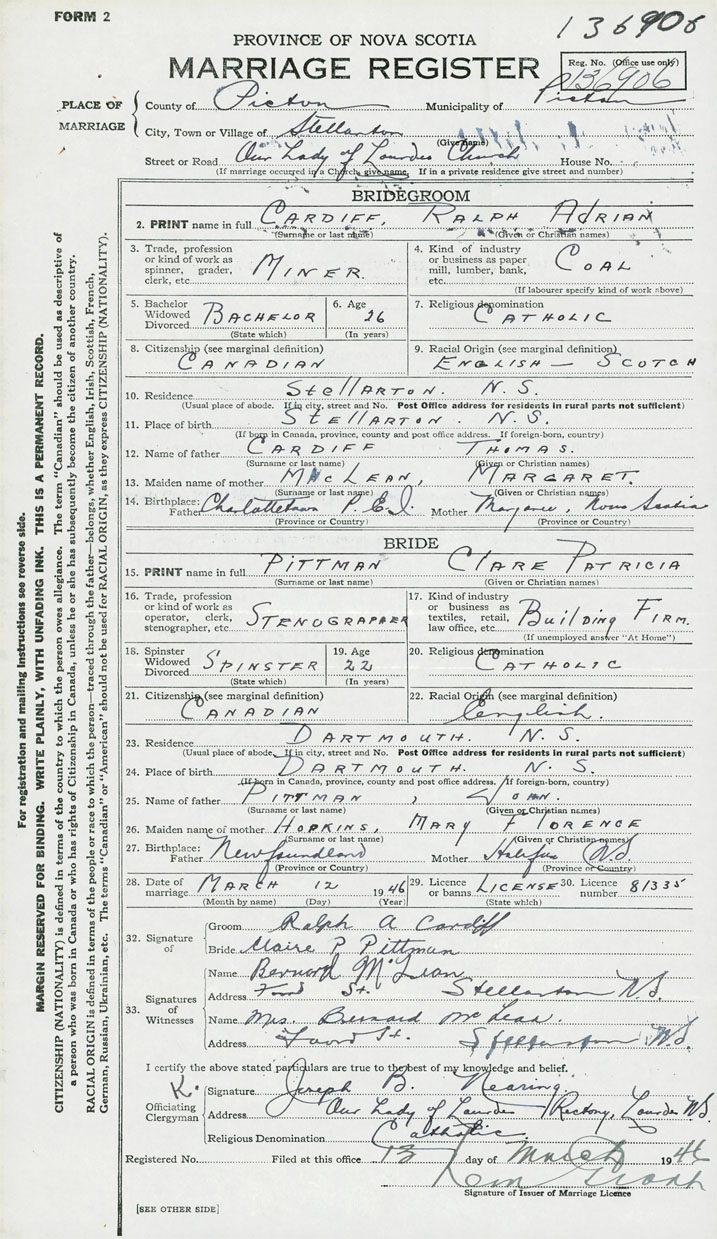 28. Date of marriage March 12 1946 29. By license or banns License 30. License number 81335