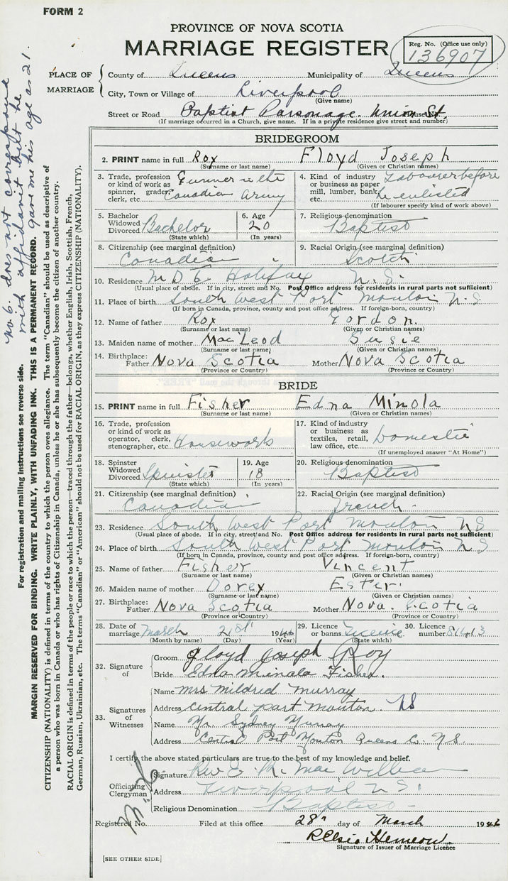 28. Date of marriage March 21 1946 29. By license or banns License 30. License number 81413