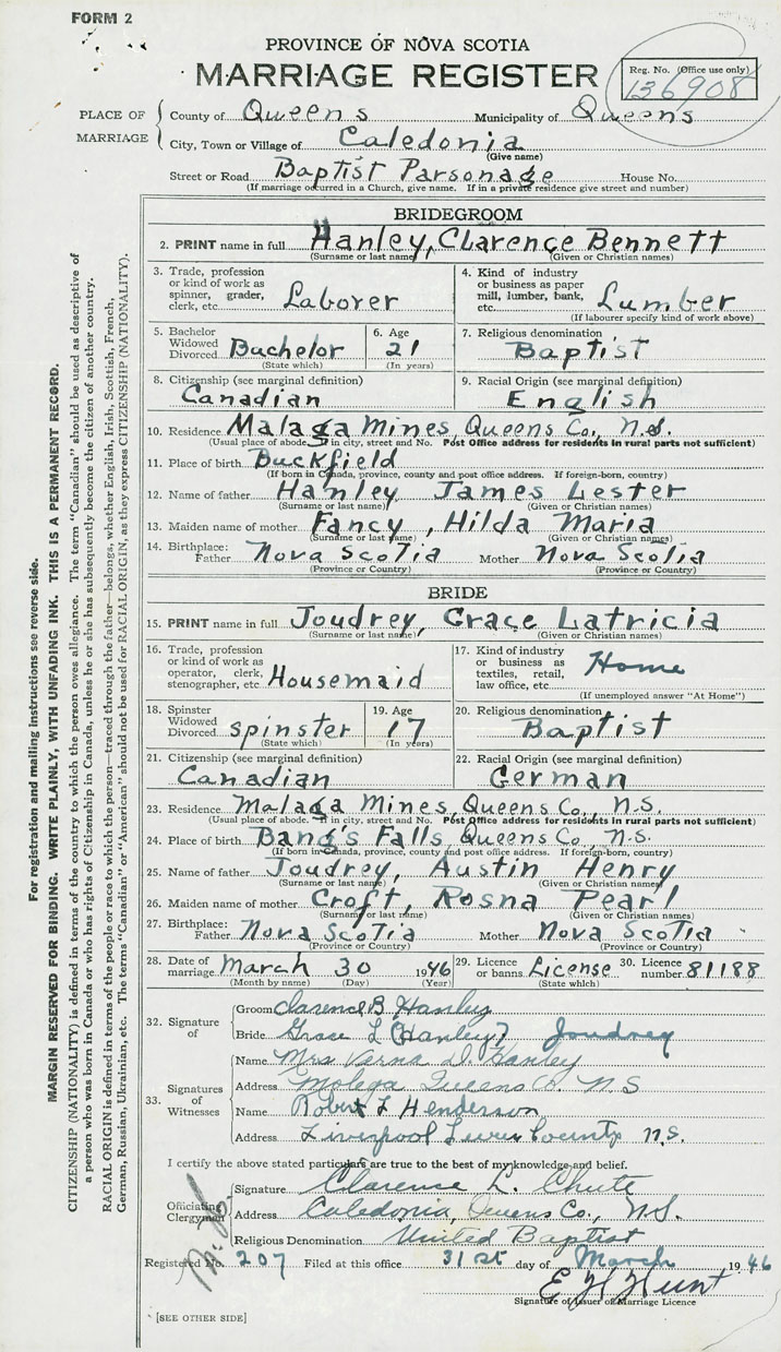 28. Date of marriage March 30 1946 29. By license or banns License 30. License number 81188