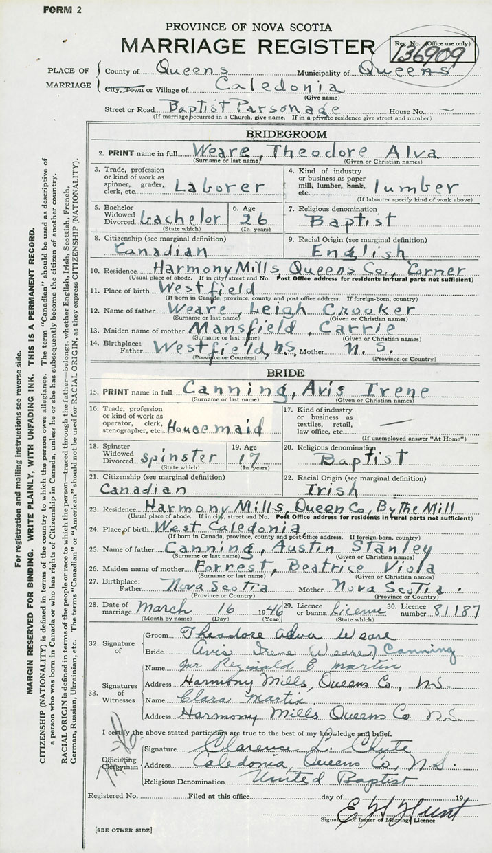 28. Date of marriage March 16 1946 29. By license or banns License 30. License number 81187