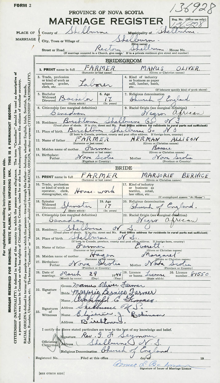 28. Date of marriage March 29 1946 29. By license or banns License 30. License number 81550