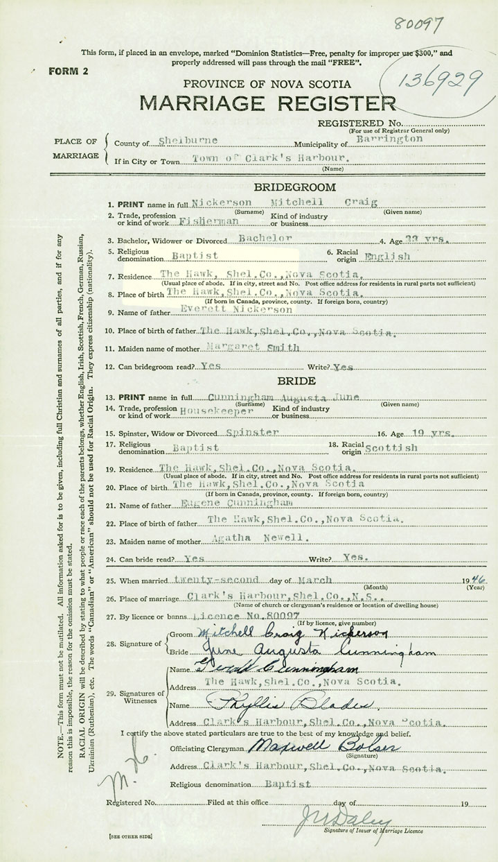 26. Place of marriage Clarks Harbour, Shelburne County