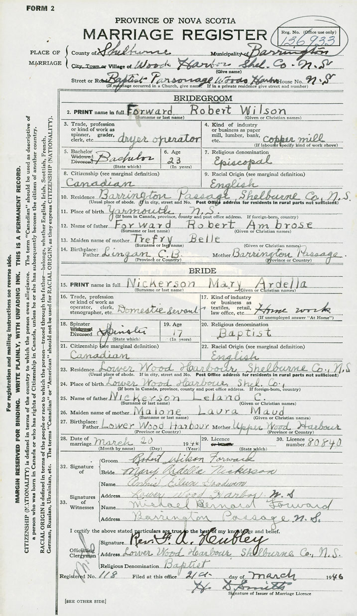 28. Date of marriage March 20 1946 29. By license or banns License 30. License number 80840