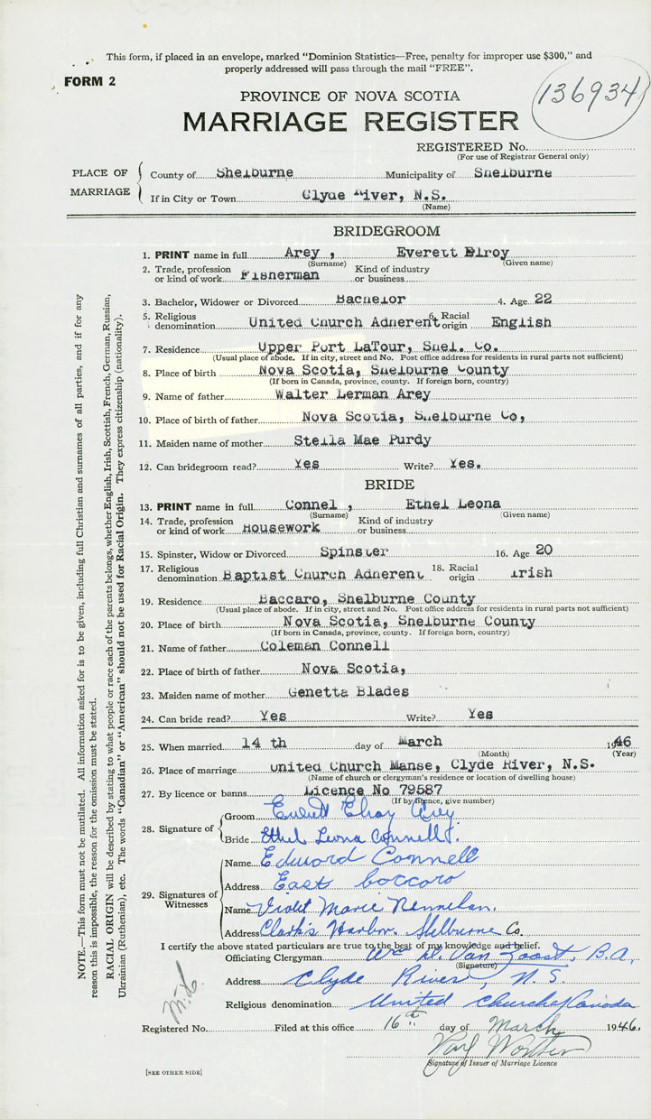 26. Place of marriage United Church Manse Clyde River, Shelburne County