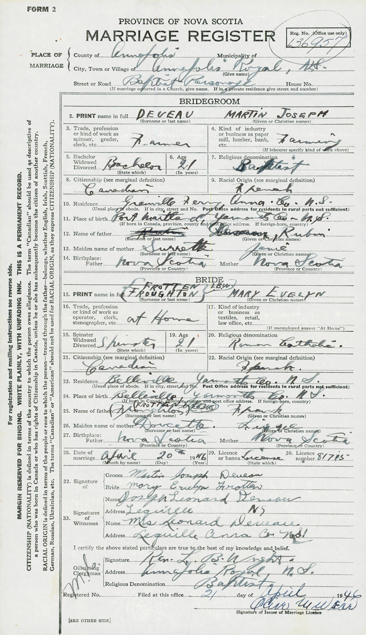 28. Date of marriage April 20 1946 29. By license or banns License 30. License number 81715