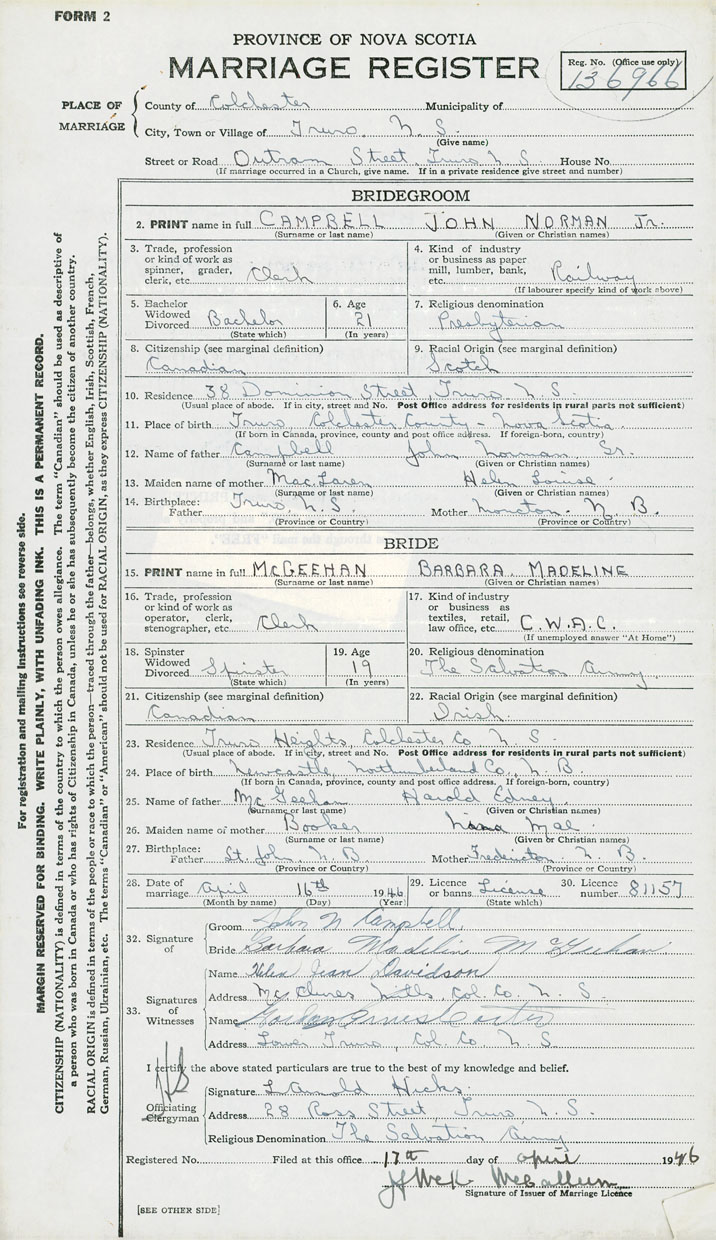 28. Date of marriage April 16 1946 29. By license or banns License 30. License number 81157