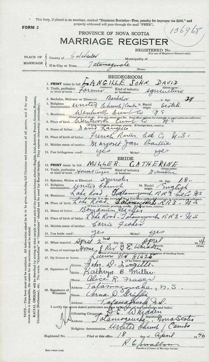 PLACE OF MARRIAGE County of Colchester in City or Town Tatamagouche