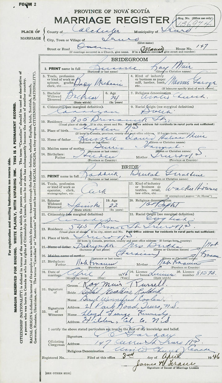 28. Date of marriage April 1 1946 29. By license or banns License 30. License number 81593