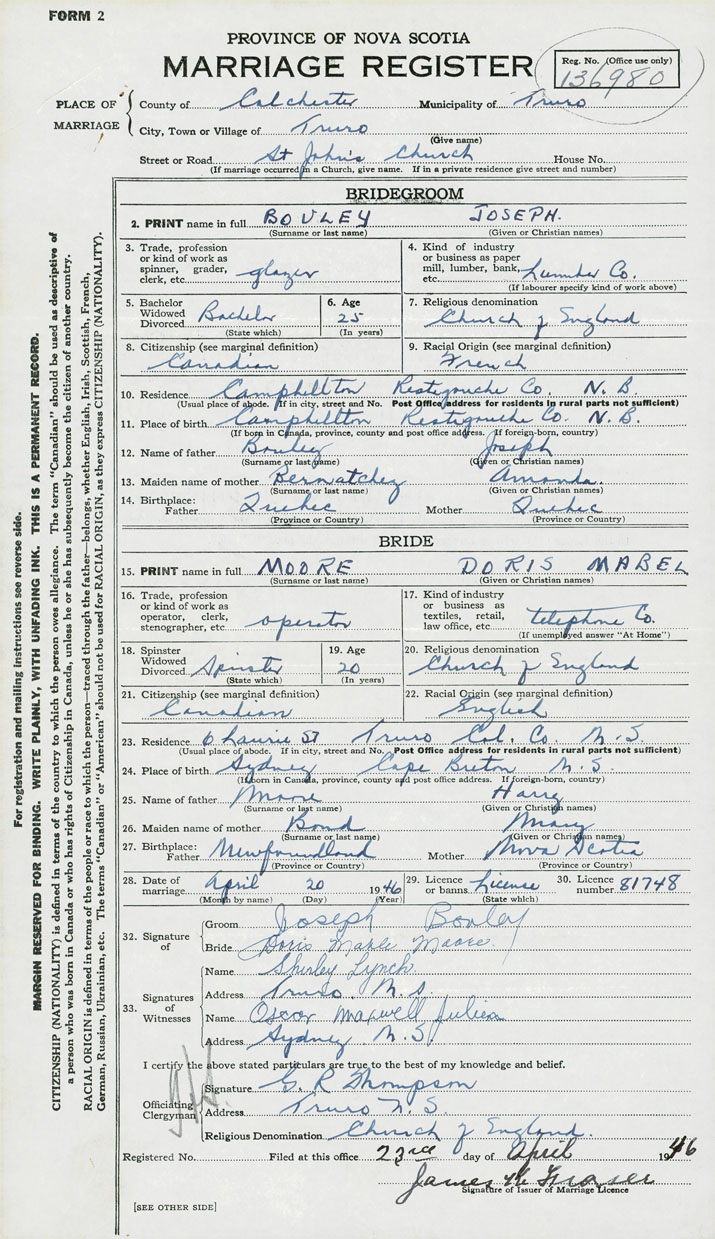 28. Date of marriage April 20 1946 29. By license or banns License 30. License number 81748