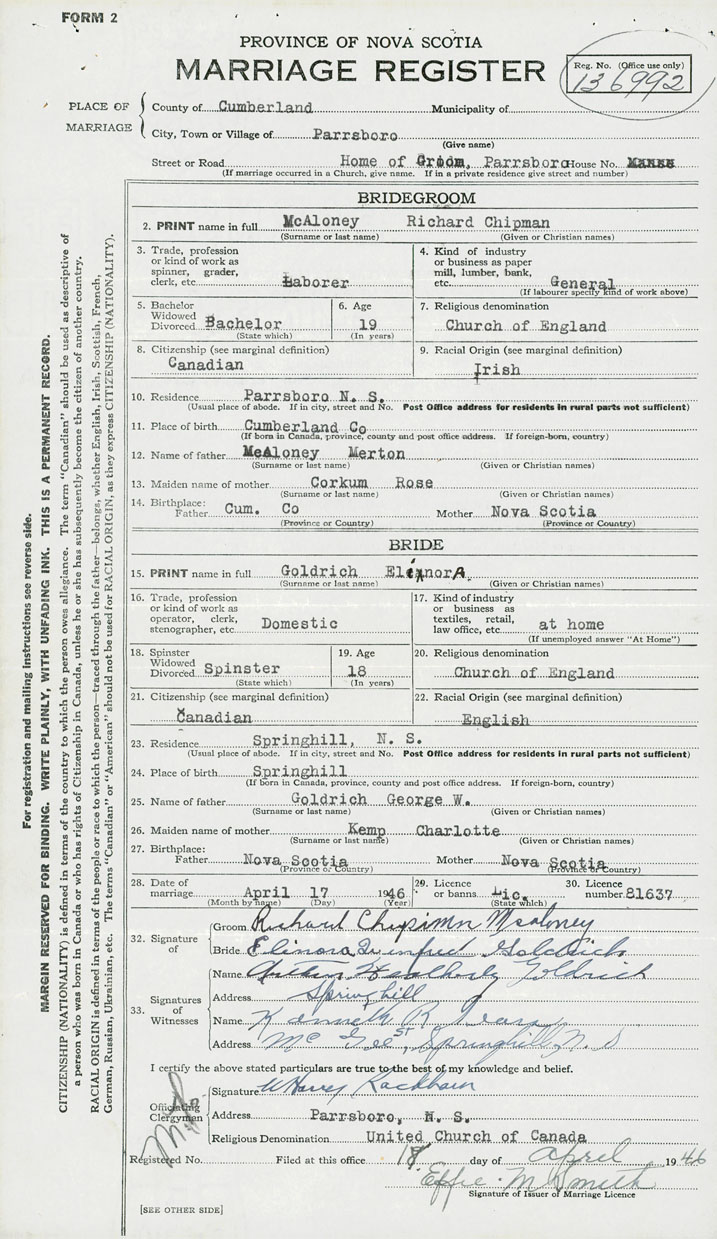 28. Date of marriage April 17 1946 29. By license or banns License 30. License number 81637