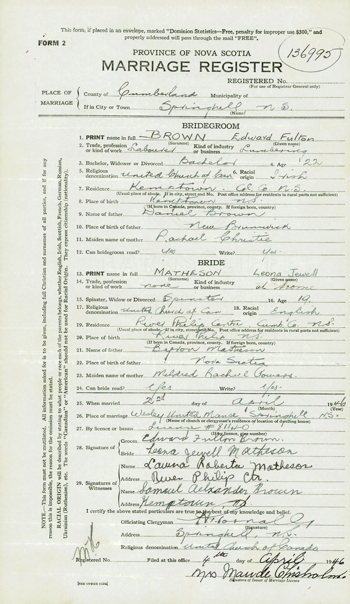 26. Place of marriage Wesley United Manse Springhill, Cumberland County
