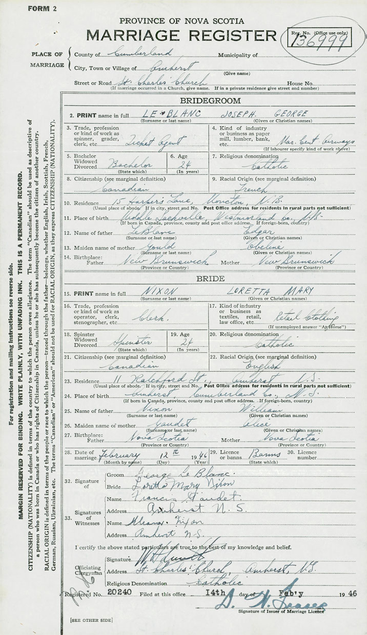 28. Date of marriage February 12 1946 29. By license or banns License 30. License number