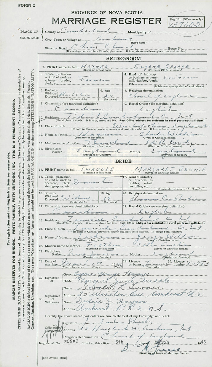 28. Date of marriage March 1 1946 29. By license or banns License 30. License number 80983