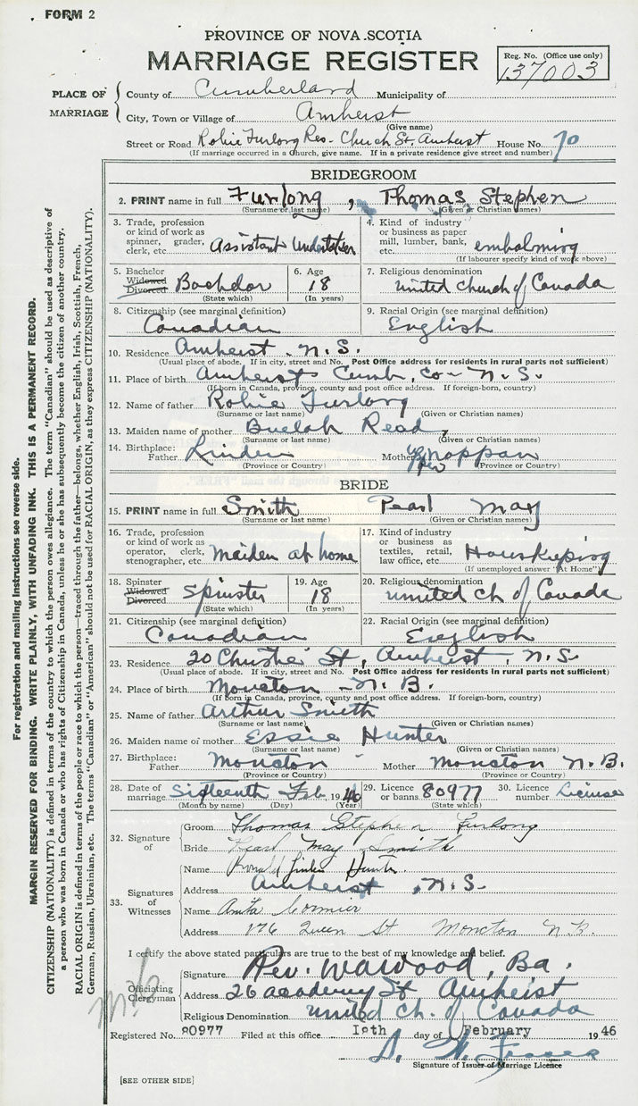 28. Date of marriage February 16 1946 29. By license or banns License 30. License number 80977