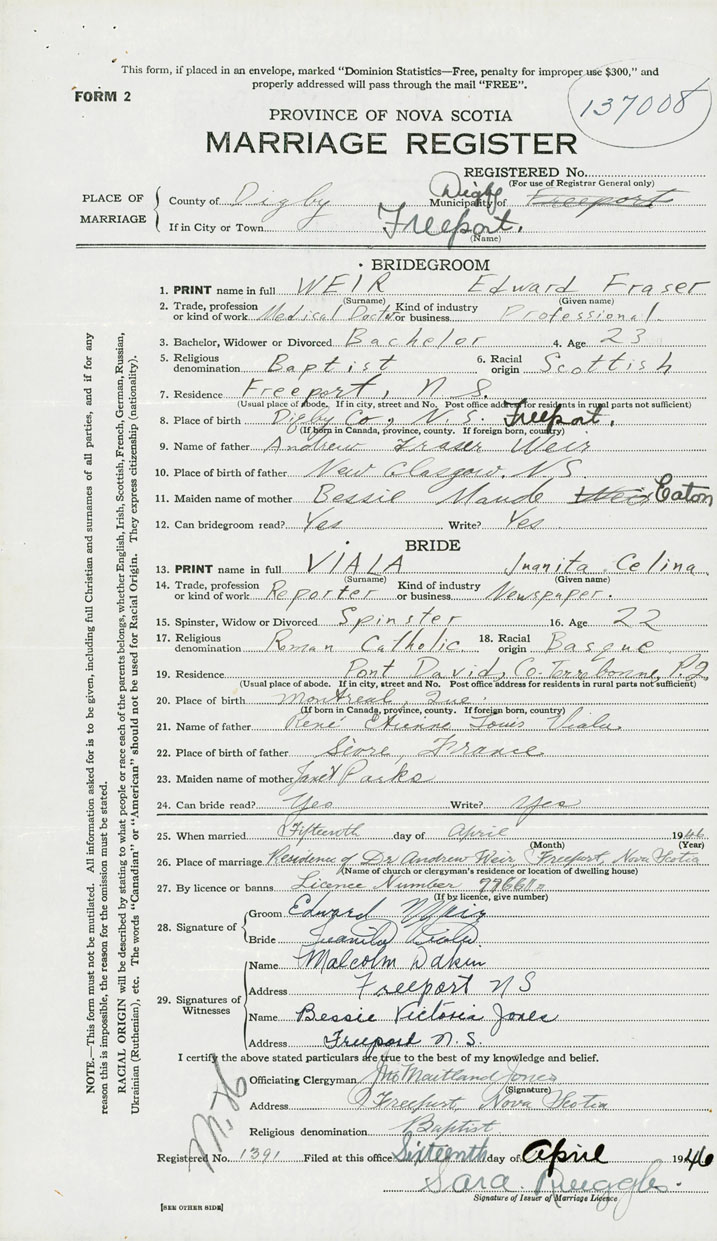 PLACE OF MARRIAGE County of Digby in City or Town Freeport