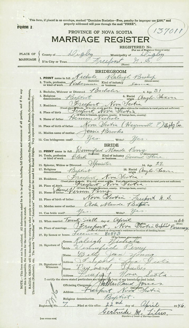 PLACE OF MARRIAGE County of Digby in City or Town Freeport