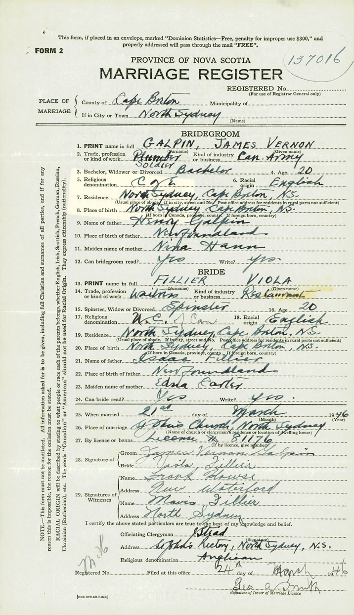 26. Place of marriage St John's Church North Sydney, Cape Breton County