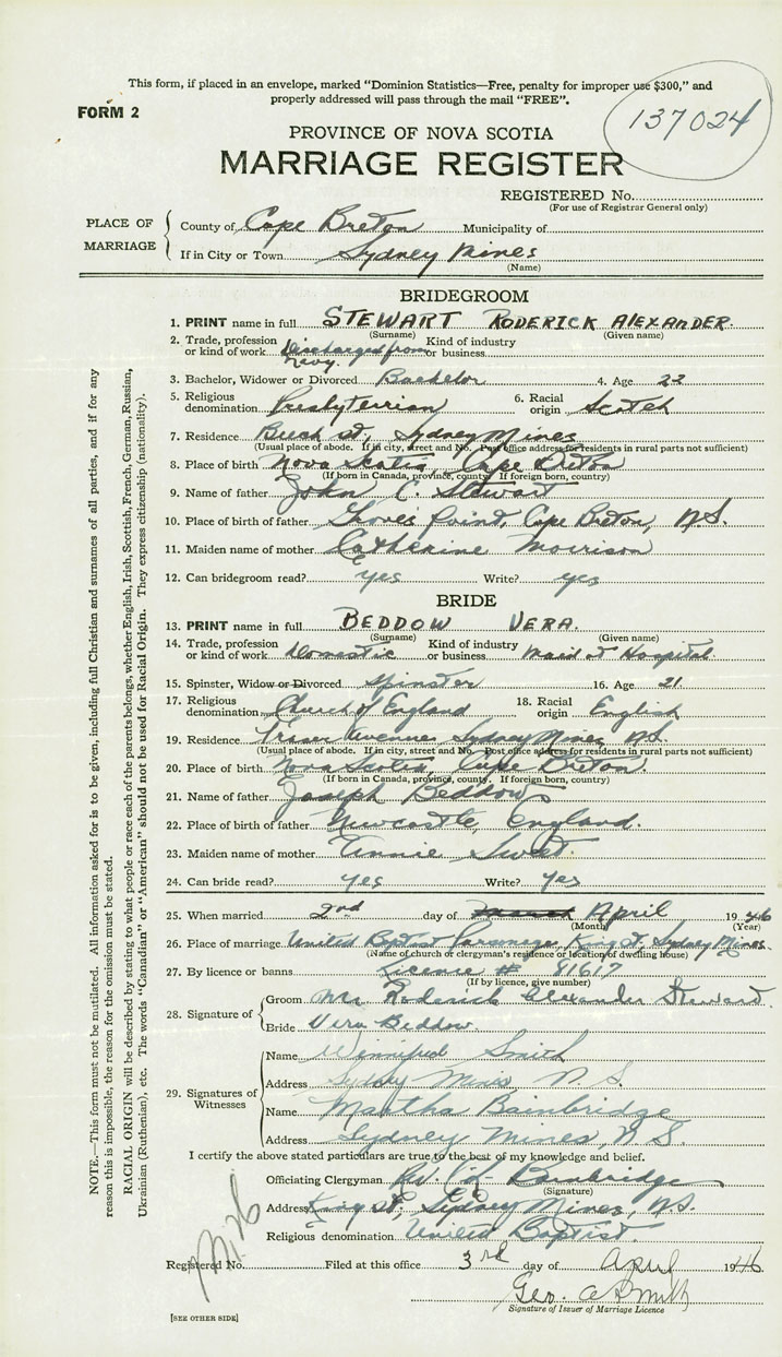 26. Place of marriage United Baptist Parsonage Sydney Mines, Cape Breton County