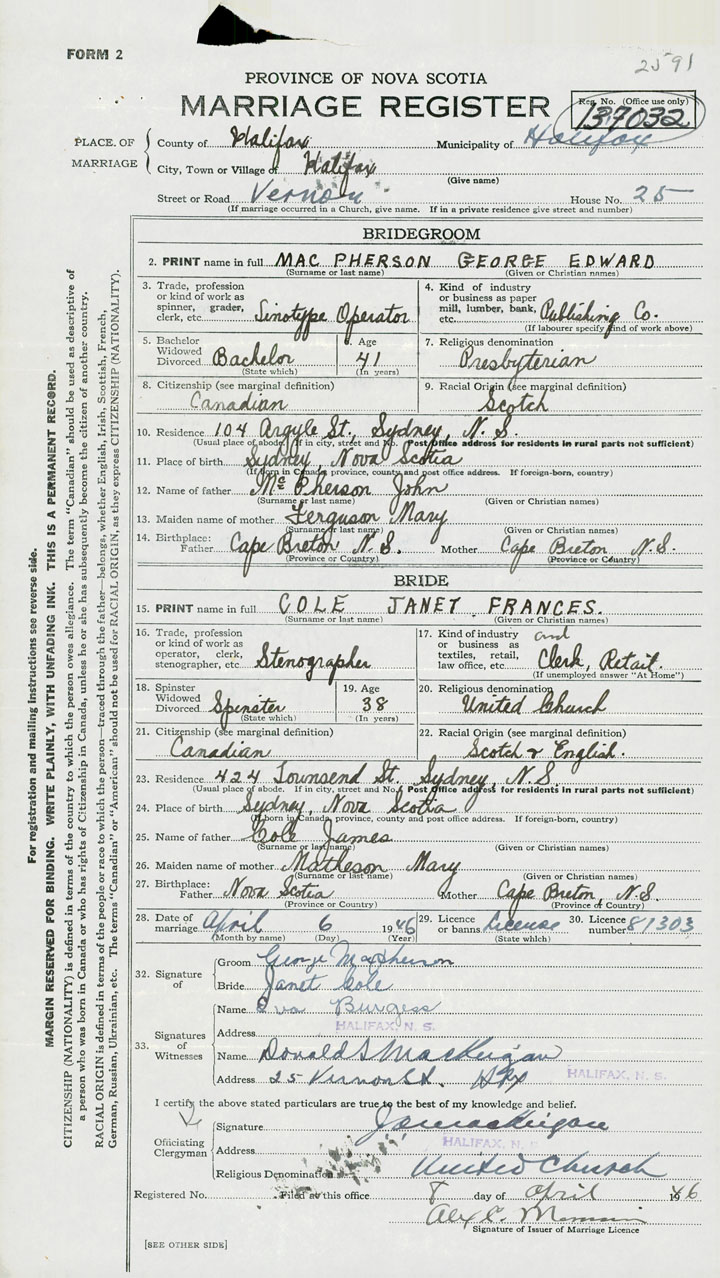 28. Date of marriage April 6 1946 29. By license or banns License 30. License number 81303