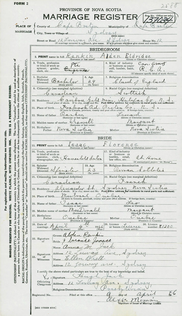28. Date of marriage April 4 1946 29. By license or banns License 30. License number 81300
