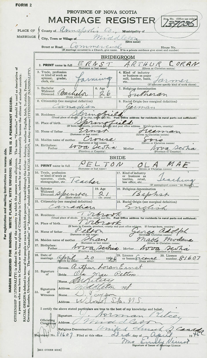 28. Date of marriage April 20 1946 29. By license or banns License 30. License number 81607