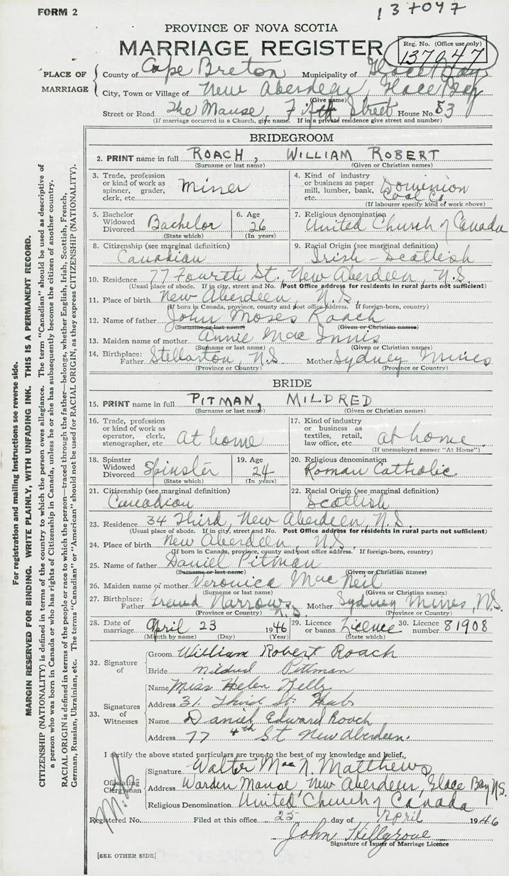 28. Date of marriage April 23 1946 29. By license or banns License 30. License number 81908