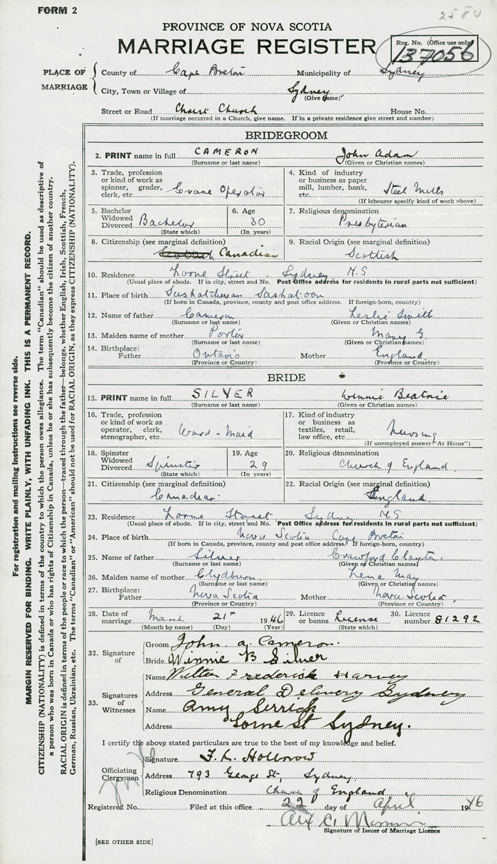 28. Date of marriage March 21 1946 29. By license or banns License 30. License number 81292