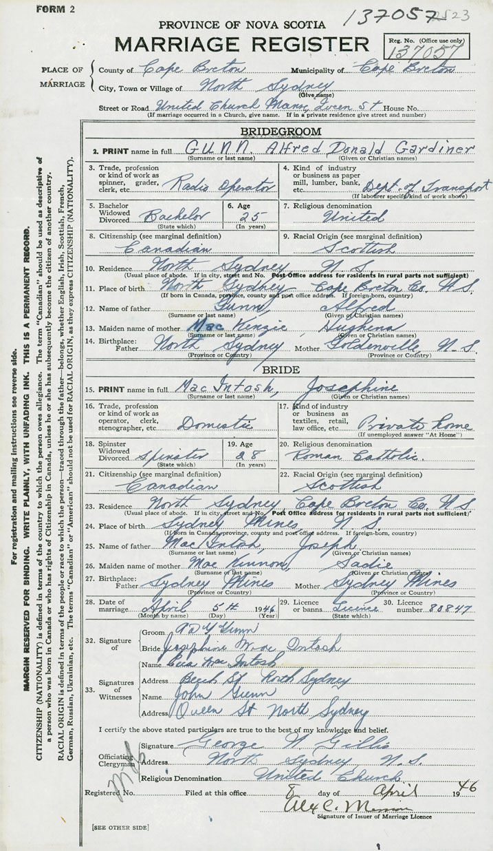 28. Date of marriage April 5 1946 29. By license or banns License 30. License number 80847