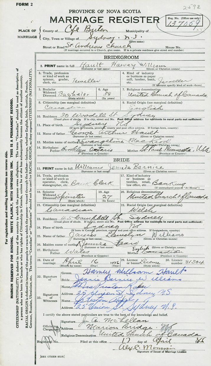 28. Date of marriage April 16 1946 29. By license or banns License 30. License number 81304