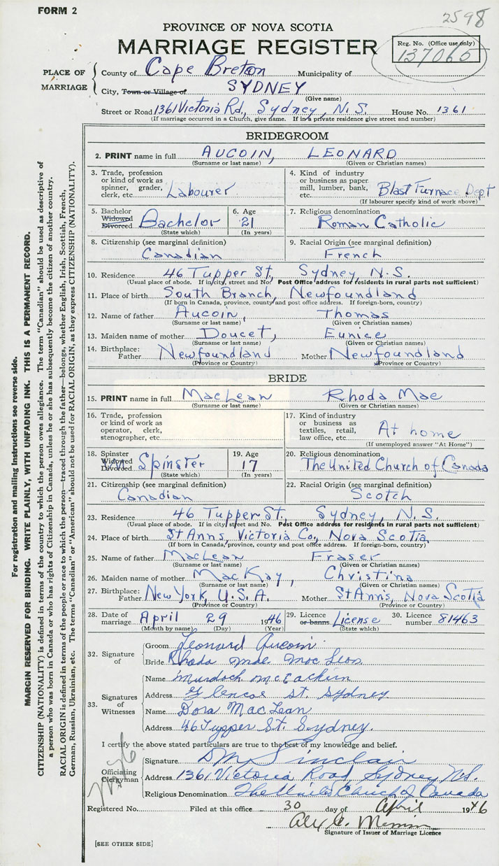 28. Date of marriage April 29 1946 29. By license or banns License 30. License number 81463