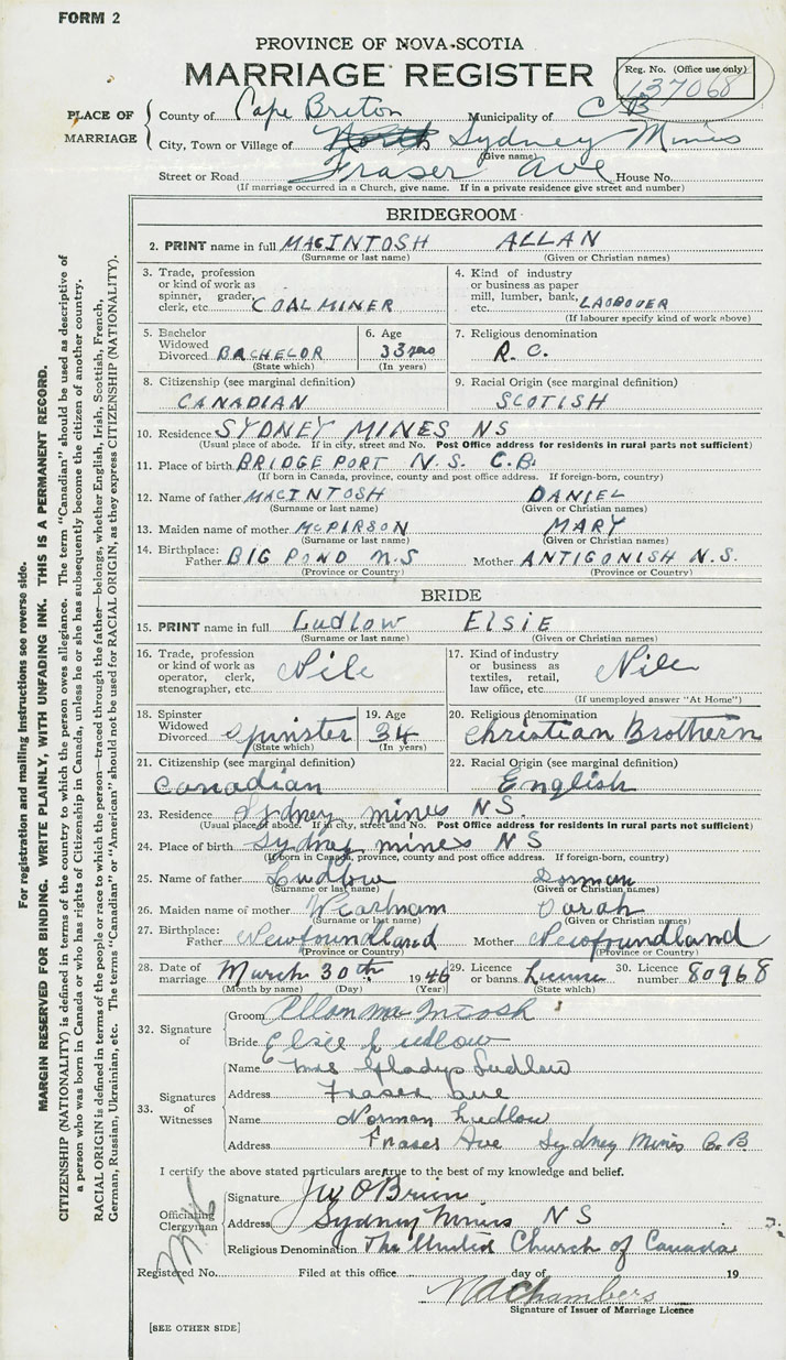 28. Date of marriage March 30 1946 29. By license or banns License 30. License number 80968