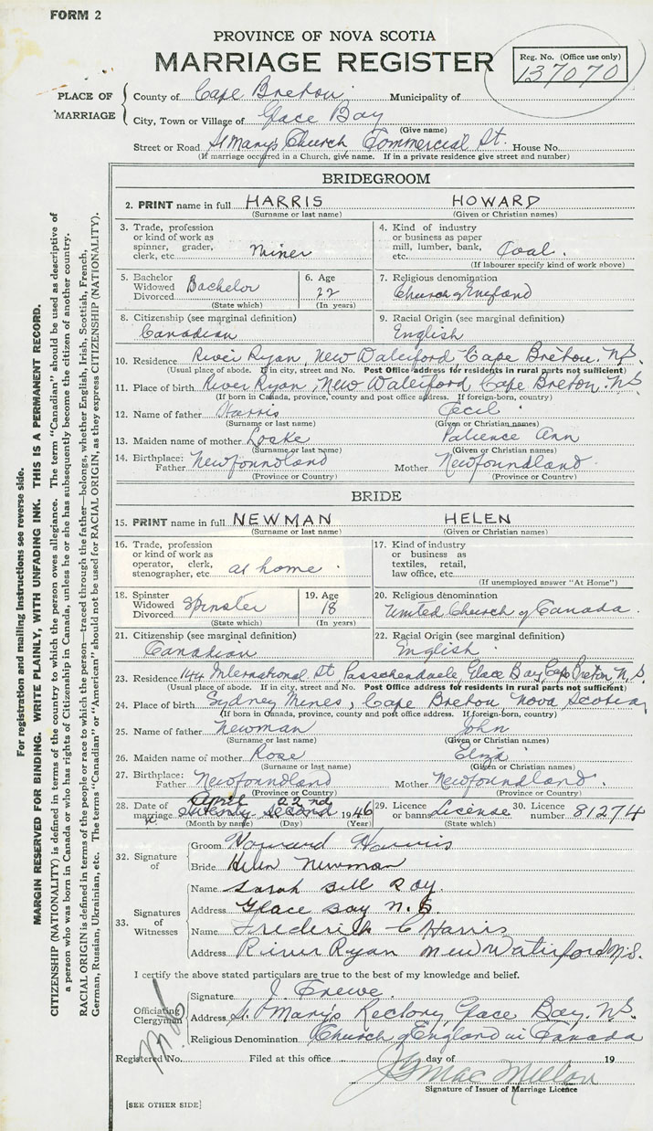14. Birthplace Father Newfoundland Mother Newfoundland