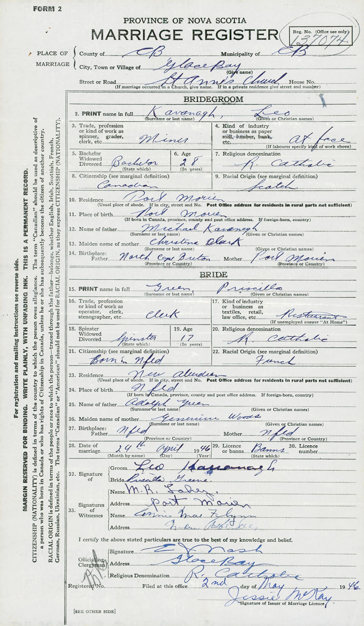 14. Birthplace Father North Cape Breton Mother Port Morien