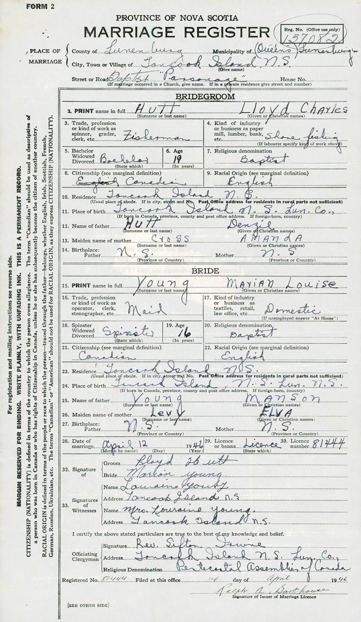 28. Date of marriage April 12 1946 29. By license or banns License 30. License number 81444