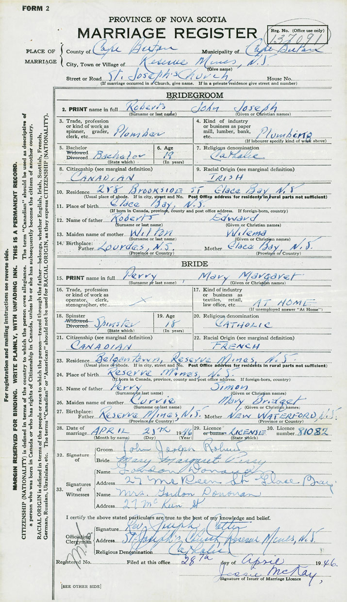 28. Date of marriage April 25 1946 29. By license or banns License 30. License number 81082