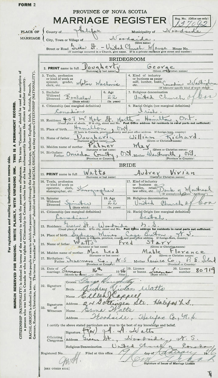 28. Date of marriage January 16 1946 29. By license or banns License 30. License number 80719