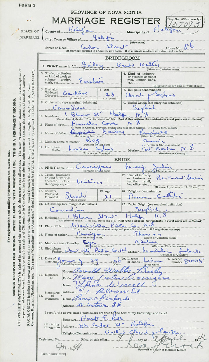 28. Date of marriage January 29 1946 29. By license or banns License 30. License number 81005
