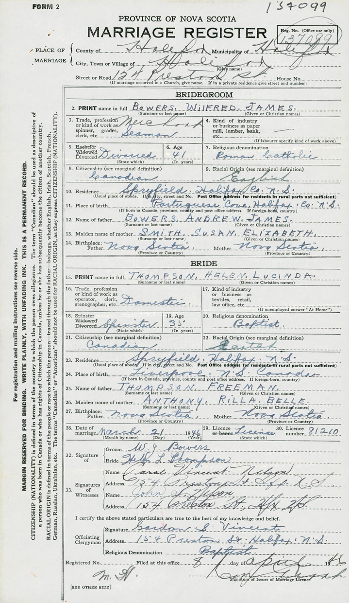 28. Date of marriage March 21 1946 29. By license or banns License 30. License number 81210
