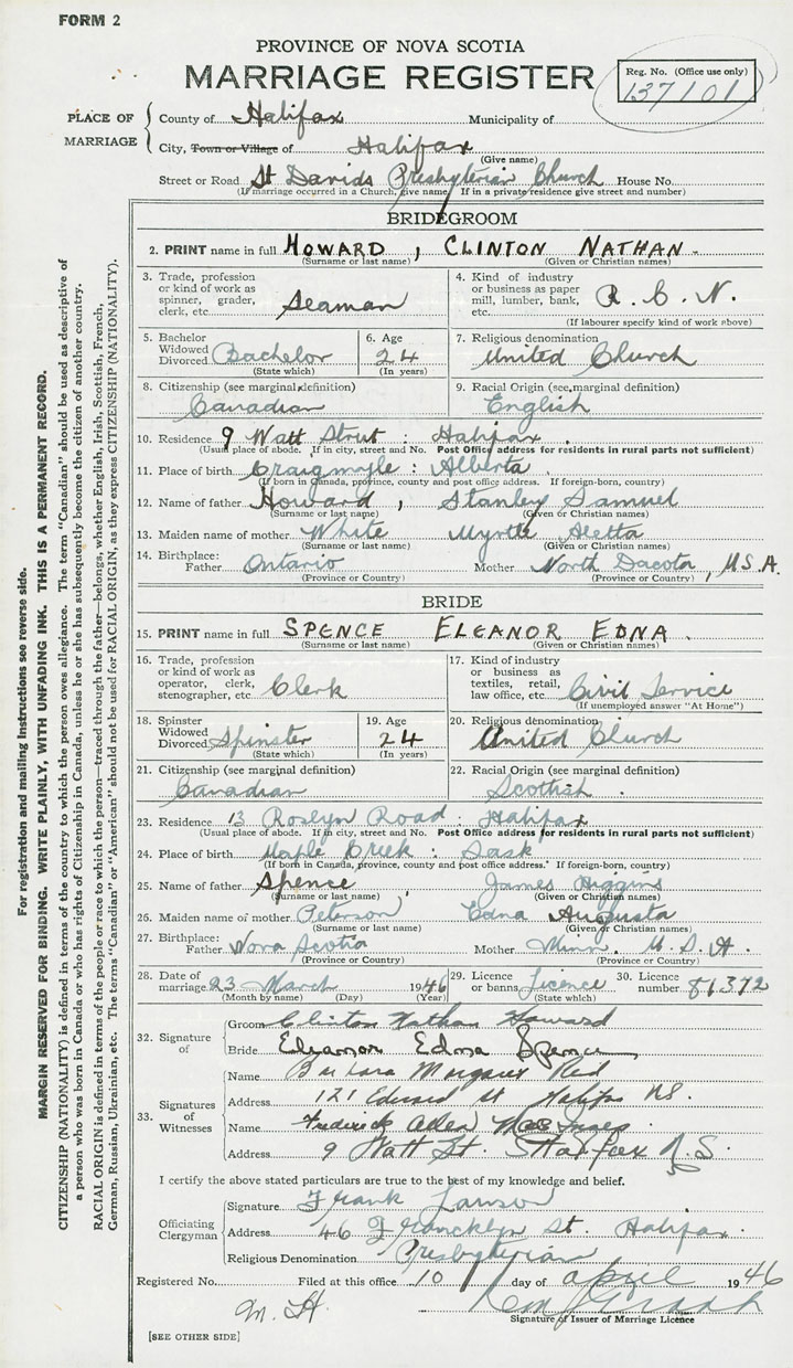 28. Date of marriage March 23 1946 29. By license or banns License 30. License number 81372