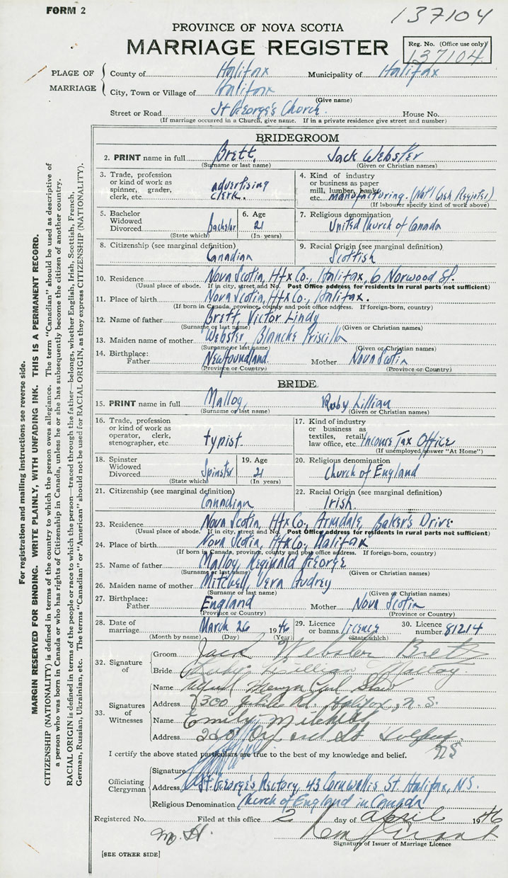 28. Date of marriage March 26 1946 29. By license or banns License 30. License number 81214