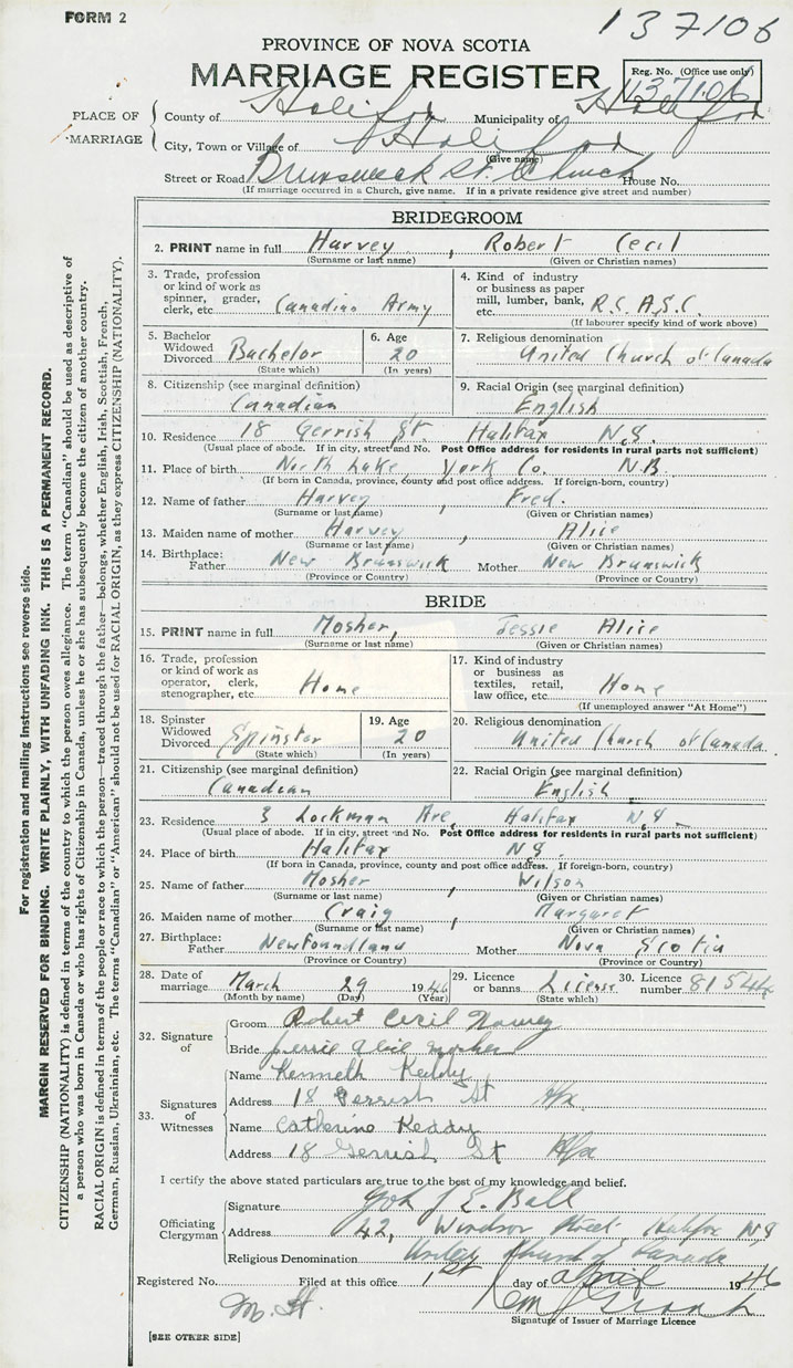 28. Date of marriage March 29 1946 29. By license or banns License 30. License number 81544