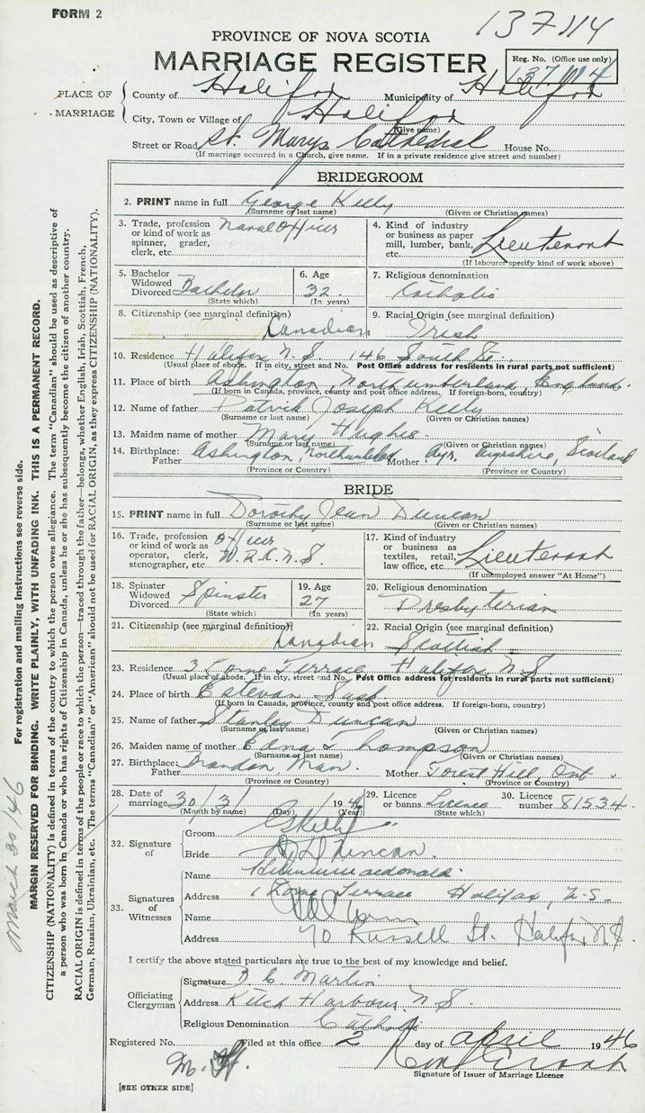 28. Date of marriage March 30 1946 29. By license or banns License 30. License number 81534
