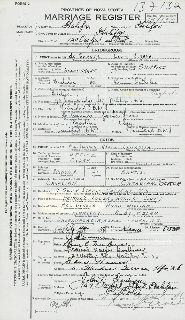 28. Date of marriage April 4 1946 29. By license or banns License 30. License number 81538