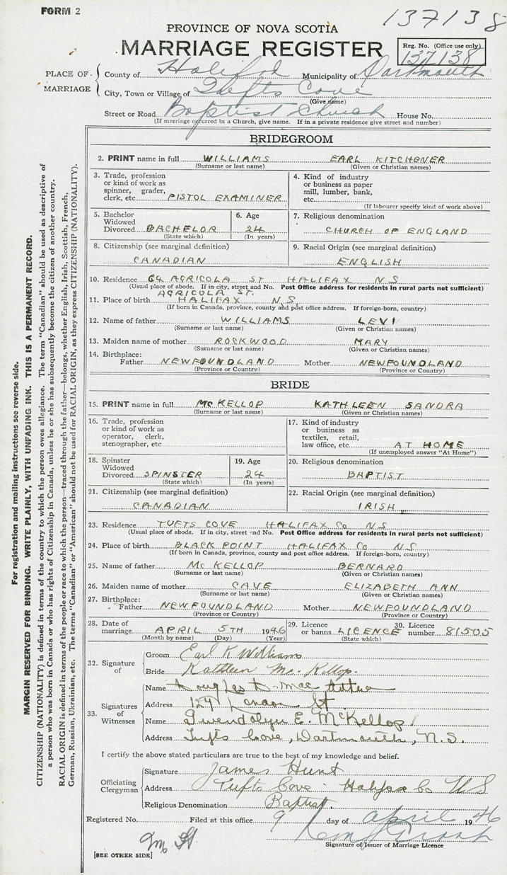 28. Date of marriage April 5 1946 29. By license or banns License 30. License number 81505