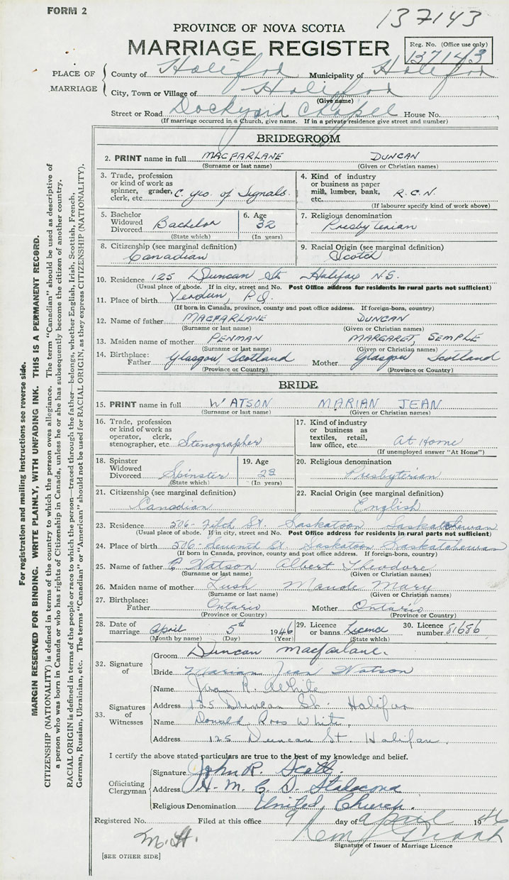 28. Date of marriage April 5 1946 29. By license or banns License 30. License number 81686