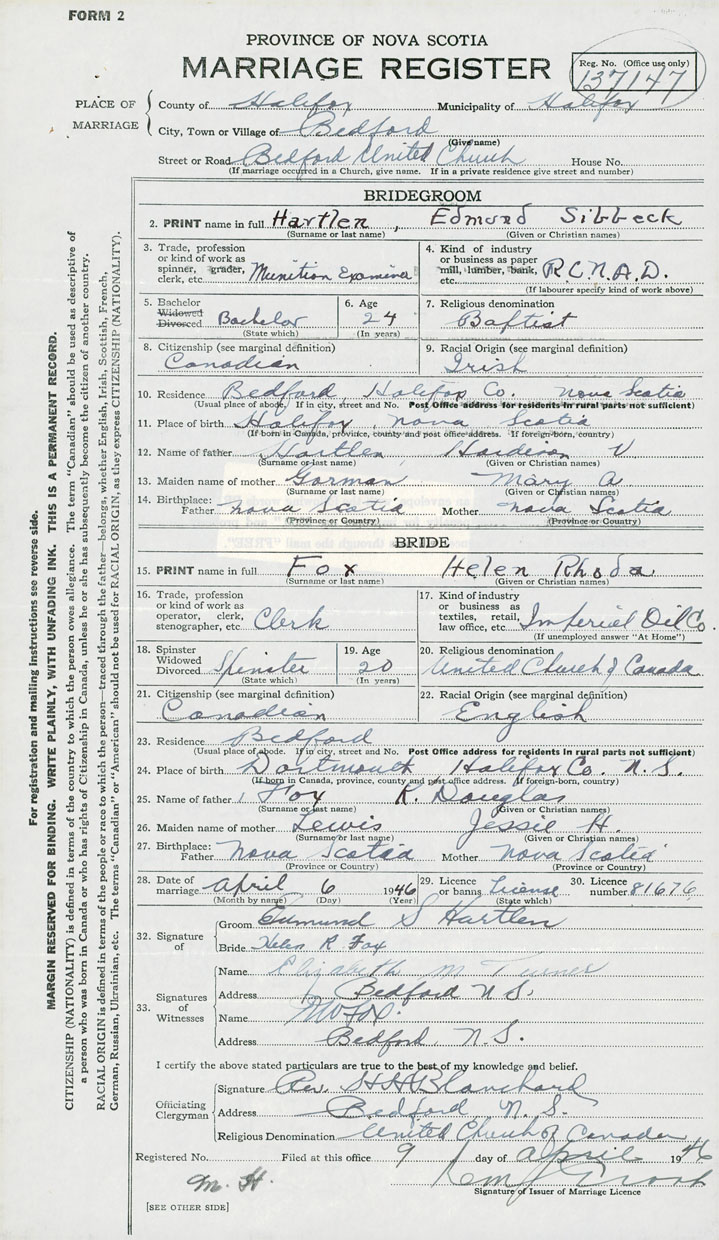 28. Date of marriage April 6 1946 29. By license or banns License 30. License number 81676