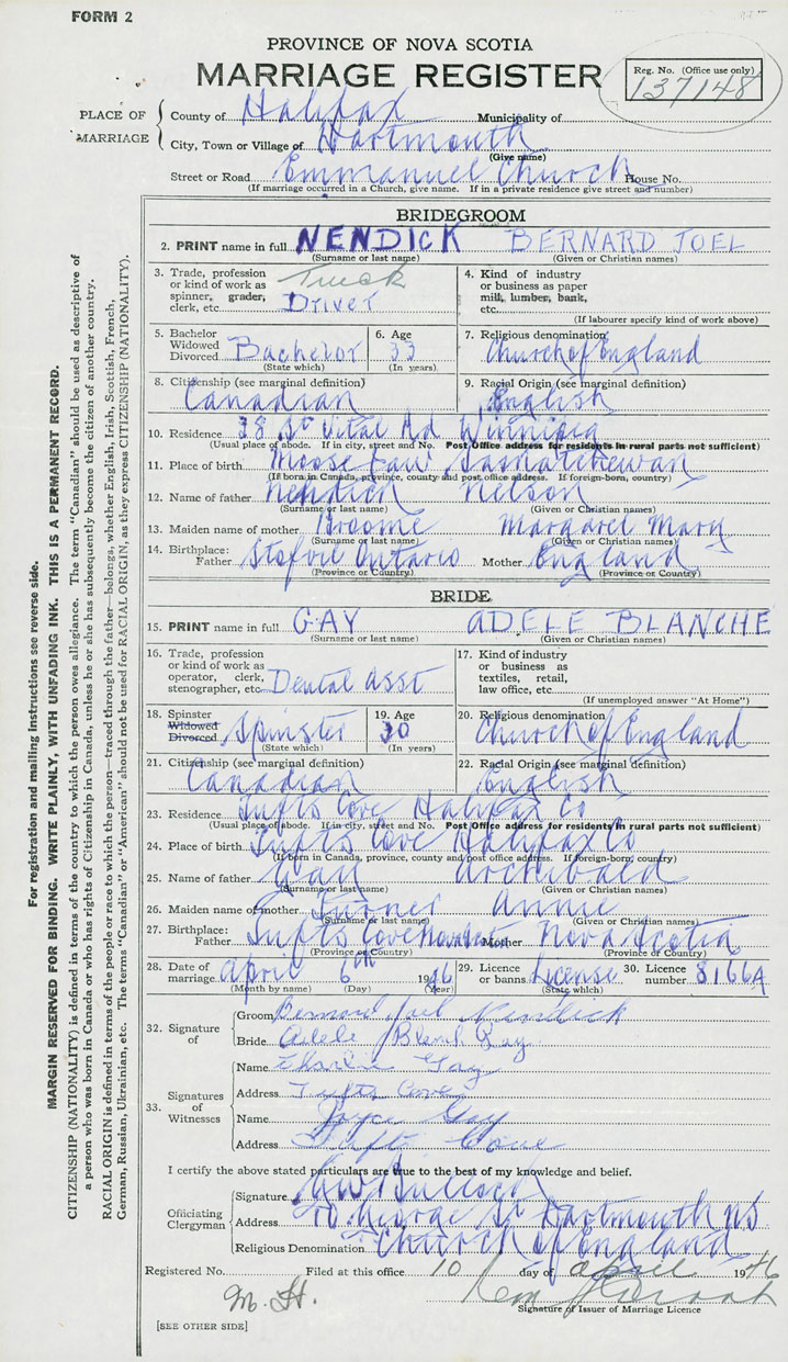 28. Date of marriage April 6 1946 29. By license or banns License 30. License number 81664