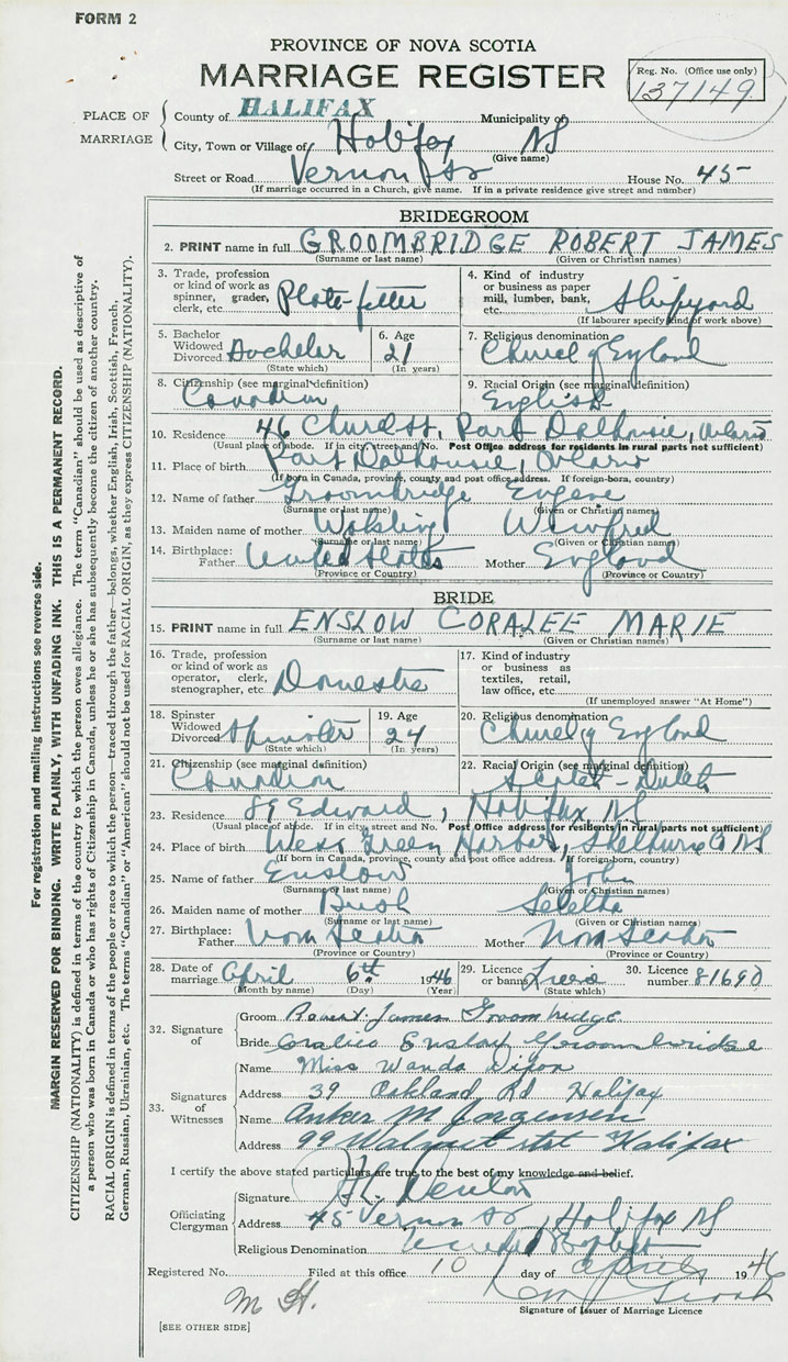 28. Date of marriage April 6 1946 29. By license or banns License 30. License number 81690