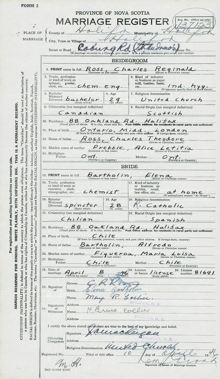 28. Date of marriage April 8 1946 29. By license or banns License 30. License number 81691