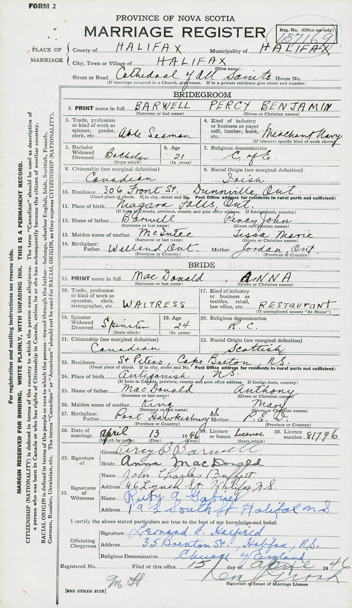 28. Date of marriage April 13 1946 29. By license or banns License 30. License number 81796